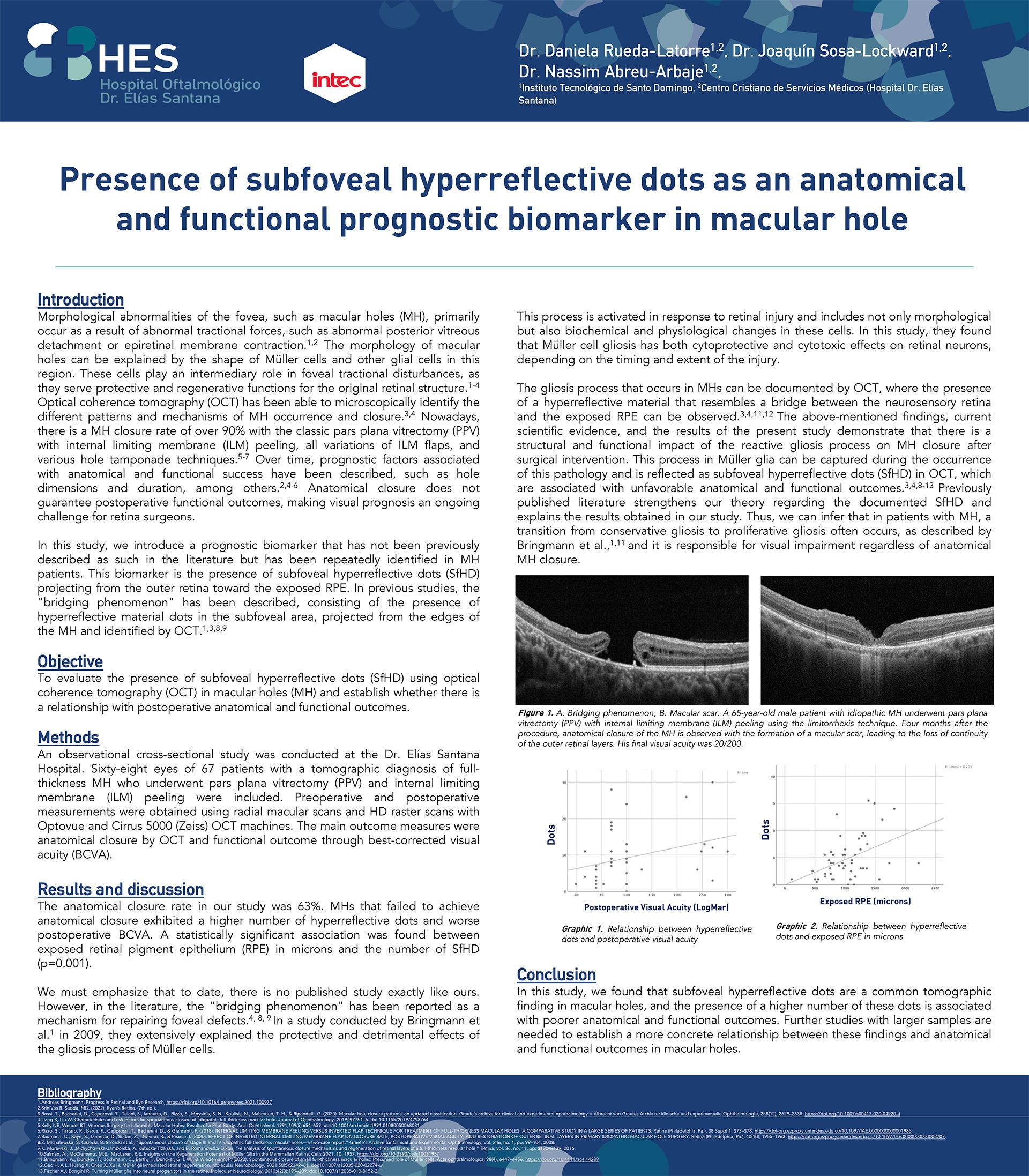 To evaluate the presence of subfoveal hyperreflective dots (SfHD) using optical coherence tomography (OCT) in macular holes (MH) and establish whether there is a relationship with postoperative anatomical and functional outcomes.