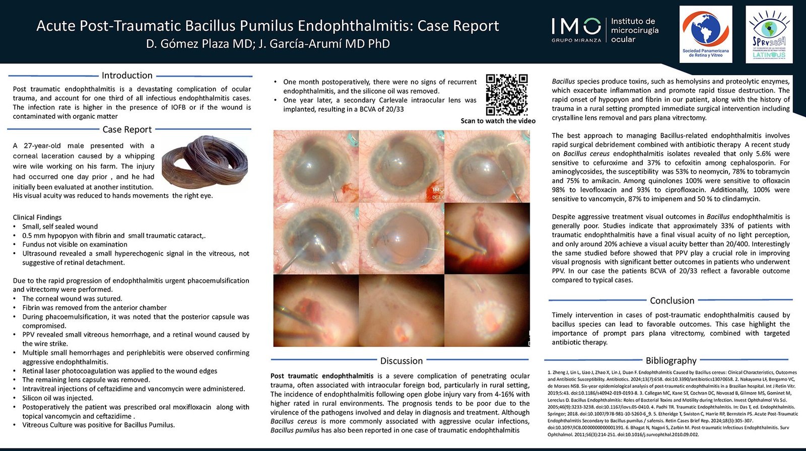 A 27-year-old male presented with a corneal laceration caused by a baling wire while working on his farm. The injury had a one-day history and was initially evaluated at another institution. Visual acuity was hand movements. The cornea had a small self-sealed wound, the anterior chamber had a 0.5 mm hypopyon and fibrin, and a traumatic cataract was noted. A pars plana vitrectomy (PPV) was performed. During surgery, the anterior chamber was cleaned, and a phacoemulsification was performed. The fundus showed multiple small hemorrhages, periphlebitis, and the wound caused by the wire. Silicone oil was used. A diagnosis of acute post-traumatic endophthalmitis was confirmed. Intravitreal injections and drops of ceftazidime and vancomycin, along with oral moxifloxacin, were prescribed. Vitreous culture was positive for Bacillus pumilus. After one month, the infection resolved, and the silicone oil was extracted. One year later, a secondary Carlevale intraocular lens (IOL) was implanted, resulting in a final uncorrected distance visual acuity (UDVA) of 20/60 and corrected distance visual acuity (CDVA) of 20/33.