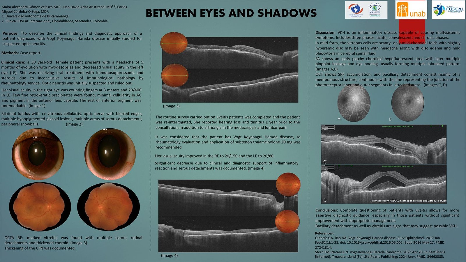 A 30 year-old female patient with initial suspicion of optic neuritis reported hearing loss and tinnitus of 1 year of evolution, in addition to arthralgia in the metacarpals and pain in the lumbar region. Her visual acuity in the right eye was counting fingers at 3 meters and 20/400 in the LE. Few fine retrokeratic precipitates were found, minimal cellularity in anterior chamber and pigment in the anterior lens capsule; ++ vitreous cellularity, optic nerve with blurred edges, multiple hypopigmented placoid lesions, multiple areas of serous detachments, peripheral snowballs. In the OCTA, marked vitreitis was found with loss of retinal architecture secondary to multiple serous retinal detachments and thickened choroid in both eyes. In the OCT of the NFL, thickening of the NFL was documented. Given the clinical and imaging findings, it was considered that the patient has Vogt Koyanagui Harada disease, so application of sub-tenon triamcinolone 20 mg was recommended in BE, achieving visual acuity in the right eye of 20/150 and the left eye of 20/150 with significant decrease of inflammatory reaction and serous detachments.