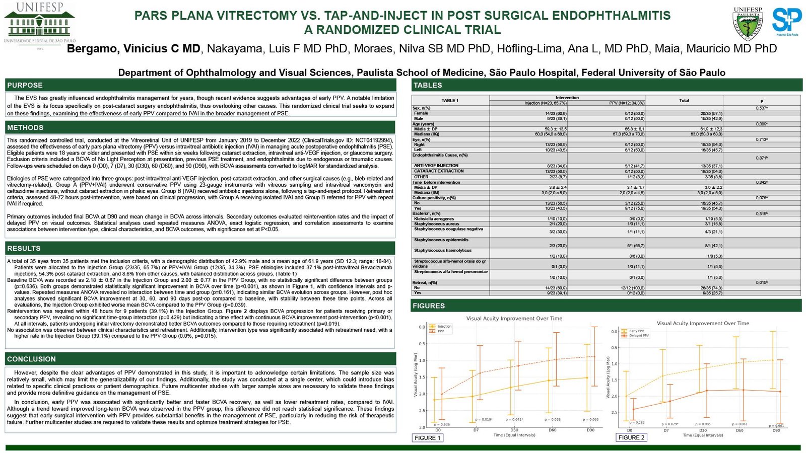 A randomized clinical trial was conducted at the Vitreoretinal Unit, UNIFESP, Brazil, from January 2019 to December 2022. Patients aged 18 or older with acute PSE post-cataract surgery, intravitreal Bevacizumab injections, or glaucoma surgery were included. Group A (PPV) underwent 23-gauge vitrectomy, while Group B (IAVI) received antibiotic injections only. Visual acuity was measured at various intervals up to 90 days post-intervention. Statistical analyses included Chi-square, ANOVA, and logistic regressions.