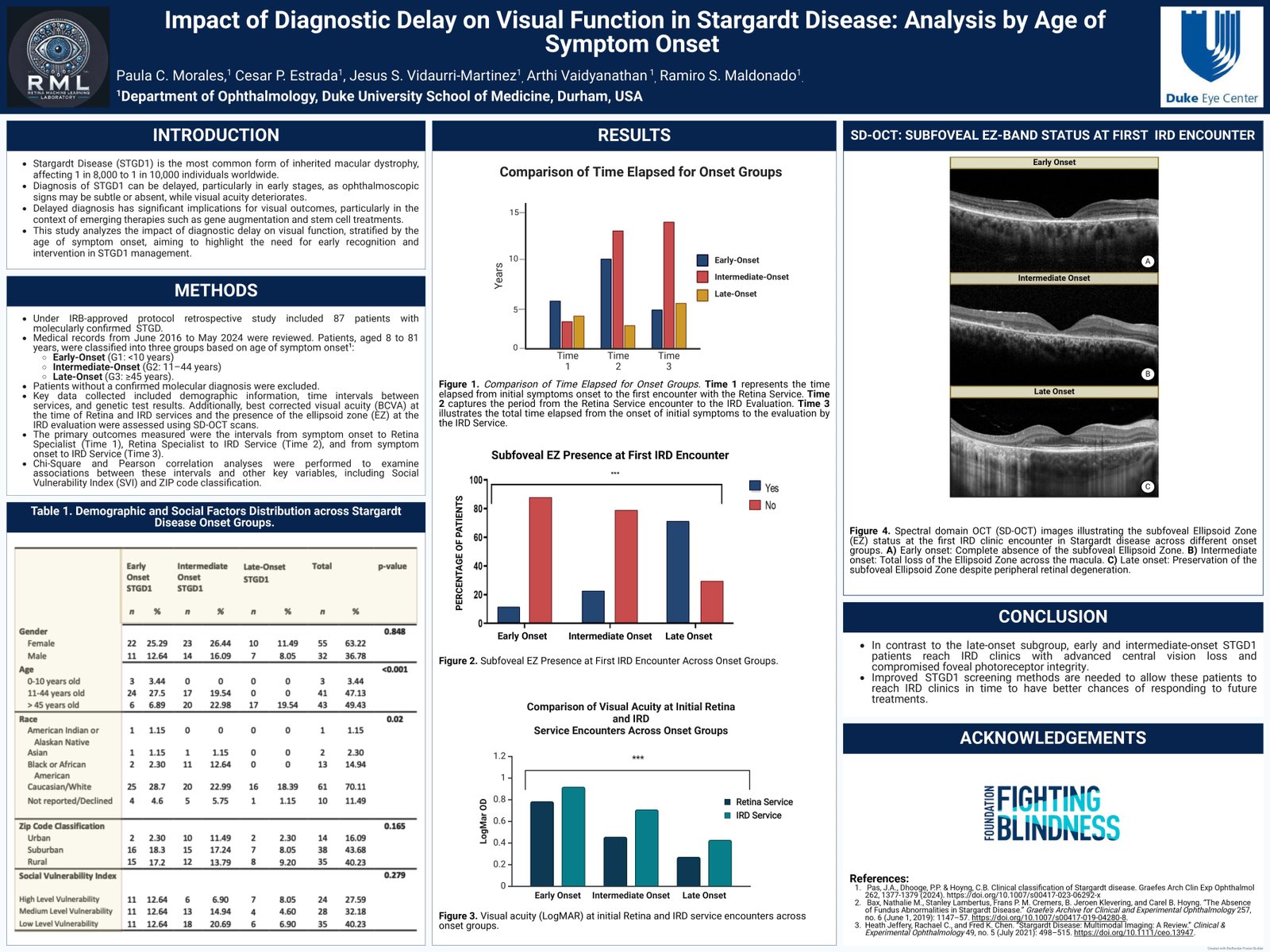 IRB-approved retrospective study included 87 patients with molecularly confirmed SD. Medical records from June 2016 to May 2024 were reviewed. Patients were classified into Early (G1), Intermediate (G2), and Late Onset (G3) groups based on age-of-symptom onset. Clinical data, including demographics, Social Vulnerability Index (SVI), LogMAR visual acuity (VA), and imaging features, were analyzed. Primary outcomes were intervals from: symptom onset to Retina specialist (S-R), Retina specialist to IRD Service (R-IRD), and onset to IRD Service (S-IRD). Chi-Square and Pearson correlation analysis was performed.
